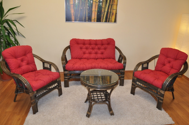 Ratanová sedací souprava je vyrobena z přírodního ratanu z masivních ratanových tyčí. Součástí soupravy je pohovka, 2 křesla, stolek a sada polstrů. | Konstrukce ratanové sedací soupravy je na většině míst trojitá a tím velice pevná. Křesla a pohovka jsou velice pohodlné díky rozložitému tvaru a kvalitním polštářům. Barva ratanové kontrukce a výpletu je hnědá. Velikost pohovky je 118x75x74 cm, nosnost 180 kg. Velikost křesla je 68x75x74 cm, nosnost křesla je 125 kg. Výška sedu je 44 cm. Stolek má průměr 55 cm a je 55 cm vysoký.