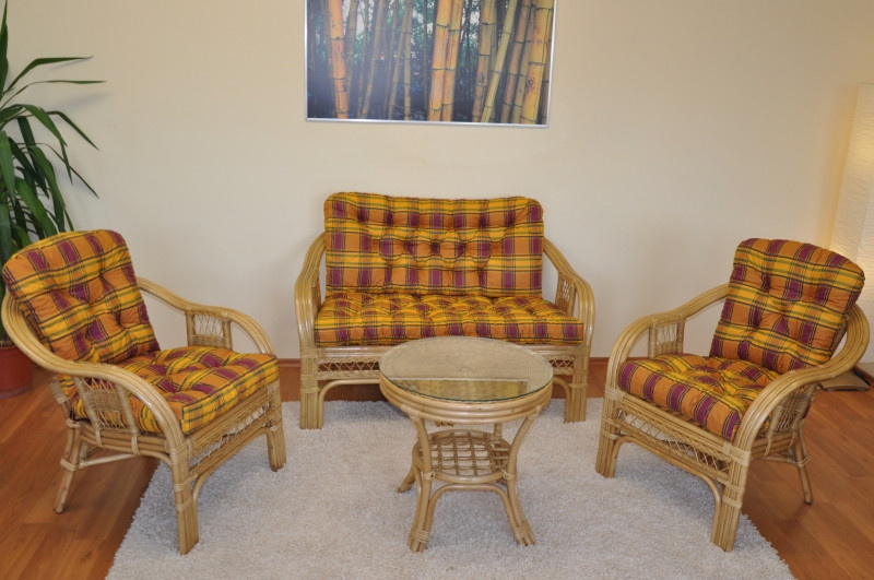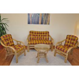 Ratanová sedací souprava je vyrobena z přírodního ratanu z masivních ratanových tyčí. Součástí soupravy je pohovka, 2 křesla, stolek a sada polstrů. | Konstrukce ratanové sedací soupravy je na většině míst trojitá a tím velice pevná. Křesla a pohovka jsou velice pohodlné díky rozložitému tvaru a kvalitním polštářům. Barva ratanové kontrukce a výpletu je medová. Velikost pohovky je 118x75x74 cm, nosnost 180 kg. Velikost křesla je 68x75x74 cm, nosnost křesla je 125 kg. Výška sedu je 44 cm. Stolek má průměr 55 cm a je 55 cm vysoký.