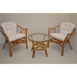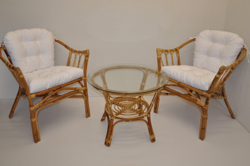 Ratanová sedací souprava Subaliu se skládá ze dvou křesel, stolku se skleněnou deskou a sady polstrů. | Ratanová sedací souprava Subaliu je vyrobena z přírodního ratanu semambo, který se vyznačuje vysokou pevností a stálostí. Velikost křesla je 65x67x77 cm. Výška sedu křesla je 44 cm. Nosnost křesla je 115 kg. Velikost stolku se skleněnou deskou je: průměr 60 cm, výška 51 cm. Polstry na tuto sedací soupravu jsou vyrobeny v České republice. Polstry jsouvyrobeny z kvalitní látky a vyznačují se vysokou kvalitou zpracování.Polstry pro nás vyrábí firma AXIN Cuschions s.r.o., která zaměstnávávýhradně místní vyučené švadleny z České republiky. Tímto způsobem sesnažíme podporovat výrobu a zaměstnanost v naší republice. Náplň polstrů je drcený molitan a polstry lze prát ručně na 40o C.>