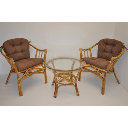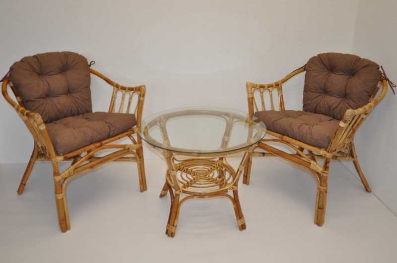 Ratanová sedací souprava Subaliu se skládá ze dvou křesel, stolku se skleněnou deskou a sady polstrů. | Ratanová sedací souprava Subaliu je vyrobena z přírodního ratanu semambo, který se vyznačuje vysokou pevností a stálostí. Velikost křesla je 65x67x77 cm. Výška sedu křesla je 44 cm. Nosnost křesla je 115 kg. Velikost stolku se skleněnou deskou je: průměr 60 cm, výška 51 cm. Polstry na tuto sedací soupravu jsou vyrobeny v České republice. Polstry jsouvyrobeny z kvalitní látky a vyznačují se vysokou kvalitou zpracování.Polstry pro nás vyrábí firma AXIN Cuschions s.r.o., která zaměstnávávýhradně místní vyučené švadleny z České republiky. Tímto způsobem sesnažíme podporovat výrobu a zaměstnanost v naší republice. Náplň polstrů je drcený molitan a polstry lze prát ručně na 40o C. >>