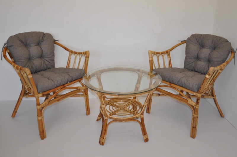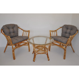 Ratanová sedací souprava Subaliu se skládá ze dvou křesel, stolku se skleněnou deskou a sady polstrů. | Ratanová sedací souprava Subaliu je vyrobena z přírodního ratanu semambo, který se vyznačuje vysokou pevností a stálostí. Velikost křesla je 65x67x77 cm. Výška sedu křesla je 44 cm. Nosnost křesla je 115 kg. Velikost stolku se skleněnou deskou je: průměr 60 cm, výška 51 cm. Polstry na tuto sedací soupravu jsou vyrobeny v České republice. Polstry jsouvyrobeny z kvalitní látky a vyznačují se vysokou kvalitou zpracování.Polstry pro nás vyrábí firma AXIN Cuschions s.r.o., která zaměstnávávýhradně místní vyučené švadleny z České republiky. Tímto způsobem sesnažíme podporovat výrobu a zaměstnanost v naší republice. Náplň polstrů je drcený molitan a polstry lze prát ručně na 40o C. > > >>