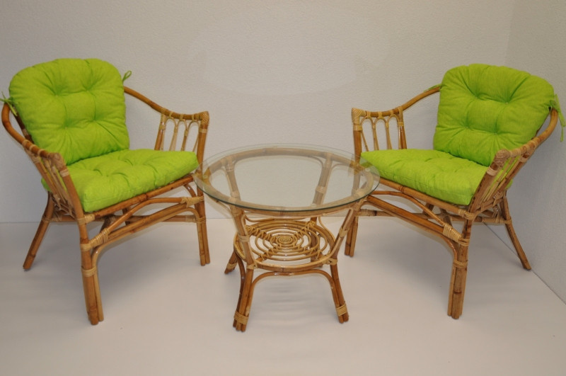 Ratanová sedací souprava Subaliu se skládá ze dvou křesel, stolku se skleněnou deskou a sady polstrů. | Ratanová sedací souprava Subaliu je vyrobena z přírodního ratanu semambo, který se vyznačuje vysokou pevností a stálostí. Velikost křesla je 65x67x77 cm. Výška sedu křesla je 44 cm. Nosnost křesla je 115 kg. Velikost stolku se skleněnou deskou je: průměr 60 cm, výška 51 cm. Polstry na tuto sedací soupravu jsou vyrobeny v České republice. Polstry jsouvyrobeny z kvalitní látky a vyznačují se vysokou kvalitou zpracování.Polstry pro nás vyrábí firma AXIN Cuschions s.r.o., která zaměstnávávýhradně místní vyučené švadleny z České republiky. Tímto způsobem sesnažíme podporovat výrobu a zaměstnanost v naší republice. Náplň polstrů je drcený molitan a polstry lze prát ručně na 40o C.>