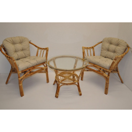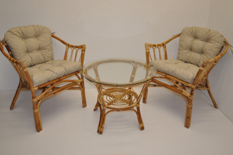 Ratanová sedací souprava Subaliu se skládá ze dvou křesel, stolku se skleněnou deskou a sady polstrů. | Ratanová sedací souprava Subaliu je vyrobena z přírodního ratanu semambo, který se vyznačuje vysokou pevností a stálostí. Velikost křesla je 65x67x77 cm. Výška sedu křesla je 44 cm. Nosnost křesla je 115 kg. Velikost stolku se skleněnou deskou je: průměr 60 cm, výška 51 cm. Polstry na tuto sedací soupravu jsou vyrobeny v České republice. Polstry jsouvyrobeny z kvalitní látky a vyznačují se vysokou kvalitou zpracování.Polstry pro nás vyrábí firma AXIN Cuschions s.r.o., která zaměstnávávýhradně místní vyučené švadleny z České republiky. Tímto způsobem sesnažíme podporovat výrobu a zaměstnanost v naší republice. Náplň polstrů je drcený molitan a polstry lze prát ručně na 40o C. >>