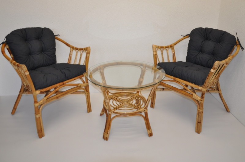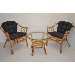 Ratanová sedací souprava Subaliu se skládá ze dvou křesel, stolku se skleněnou deskou a sady polstrů. | Ratanová sedací souprava Subaliu je vyrobena z přírodního ratanu semambo, který se vyznačuje vysokou pevností a stálostí. Velikost křesla je 65x67x77 cm. Výška sedu křesla je 44 cm. Nosnost křesla je 115 kg. Velikost stolku se skleněnou deskou je: průměr 60 cm, výška 51 cm. Polstry na tuto sedací soupravu jsou vyrobeny v České republice. Polstry jsouvyrobeny z kvalitní látky a vyznačují se vysokou kvalitou zpracování.Polstry pro nás vyrábí firma AXIN Cuschions s.r.o., která zaměstnávávýhradně místní vyučené švadleny z České republiky. Tímto způsobem sesnažíme podporovat výrobu a zaměstnanost v naší republice. Náplň polstrů je drcený molitan a polstry lze prát ručně na 40o C. >>