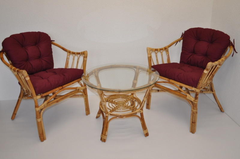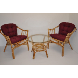 Ratanová sedací souprava Subaliu se skládá ze dvou křesel, stolku se skleněnou deskou a sady polstrů. | Ratanová sedací souprava Subaliu je vyrobena z přírodního ratanu semambo, který se vyznačuje vysokou pevností a stálostí. Velikost křesla je 65x67x77 cm. Výška sedu křesla je 44 cm. Nosnost křesla je 115 kg. Velikost stolku se skleněnou deskou je: průměr 60 cm, výška 51 cm. Polstry na tuto sedací soupravu jsou vyrobeny v České republice. Polstry jsouvyrobeny z kvalitní látky a vyznačují se vysokou kvalitou zpracování.Polstry pro nás vyrábí firma AXIN Cuschions s.r.o., která zaměstnávávýhradně místní vyučené švadleny z České republiky. Tímto způsobem sesnažíme podporovat výrobu a zaměstnanost v naší republice. Náplň polstrů je drcený molitan a polstry lze prát ručně na 40o C.>