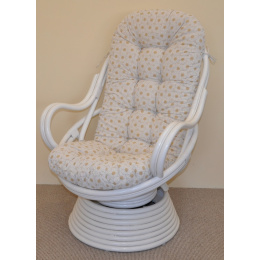 Ratanové houpací křeslo je vyrobeno z přírodního ratanu v bílém provedení ratanové konstrukce a polstru dle obrázku. | Barva ratanové konstrukce je bílá. Velikost ratanového křesla je 77x87x100 cm, nosnost 110kg. Kovový díl se čtyřmi pružinami zajišťuje pohodlné houpání a možnost otáčení křesla o 360 stupňů. Polstr je vyrobený v ČR a je pratelný na 40oC.