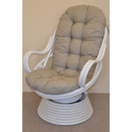 Ratanové houpací křeslo je vyrobeno z přírodního ratanu v bílém provedení ratanové konstrukce a polstru dle obrázku. | Barva ratanové konstrukce je bílá. Velikost ratanového křesla je 77x87x100 cm, nosnost 110kg. Kovový díl se čtyřmi pružinami zajišťuje pohodlné houpání a možnost otáčení křesla o 360 stupňů. Polstr je vyrobený v ČR a je pratelný na 40oC.
