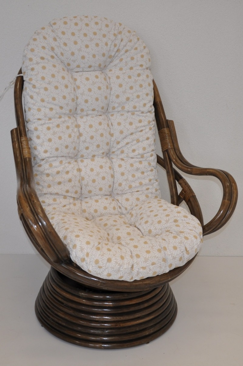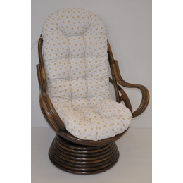 Ratanové houpací křeslo je vyrobeno z přírodního ratanu v barevném provedení konstrukce hnědé a polstru dle obrázku. | Barva ratanové konstrukce i ratanového výpletu je hnědá. Velikost ratanového křesla je 77x87x100 cm. Nosnost křesla swivel je 110kg. Kovový díl se čtyřmi pružinami zajišťuje pohodlné houpání a možnost otáčení křesla o 360 stupňů. Polstr je vyrobený v ČR a je pratelný na 40oC.