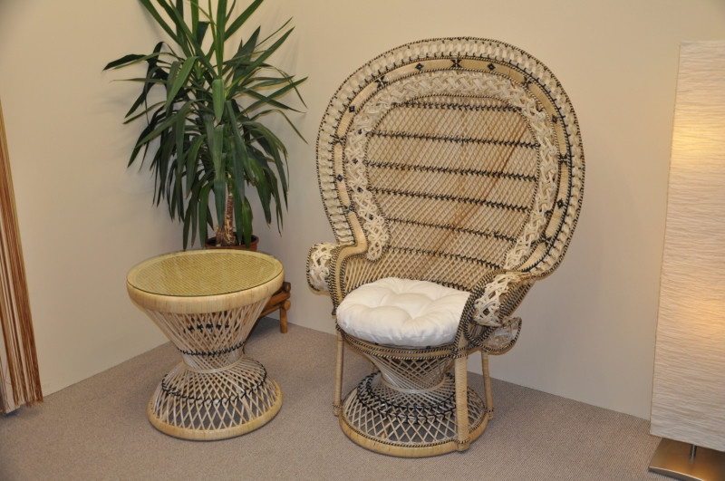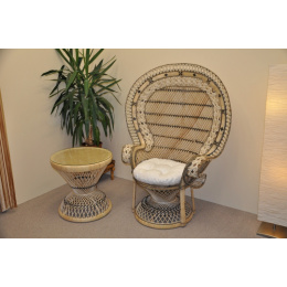 Křeslo King s výpletem z přírodního ratanu. | Konstrukce křesla je tvořena v kombinaci masivních ratanových tyčí a kovu. Výplet je tvořen přírodním ratanem. Velikost křesla je 113x75x150 cm. Nosnost křesla je 130 kg. Výška sedu je 50 cm. Stolek se skleněnou deskou má průměr 60 cm a je 60 cm vysoký.