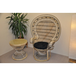 Křeslo King s výpletem z přírodního ratanu. | Konstrukce křesla je tvořena v kombinaci masivních ratanových tyčí a kovu. Výplet je tvořen přírodním ratanem. Velikost křesla je 113x75x150 cm. Nosnost křesla je 130 kg. Výška sedu je 50 cm. Stolek se skleněnou deskou má průměr 60 cm a je 60 cm vysoký.