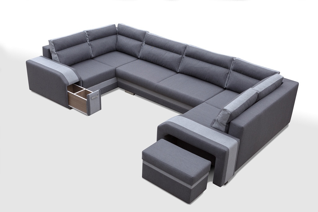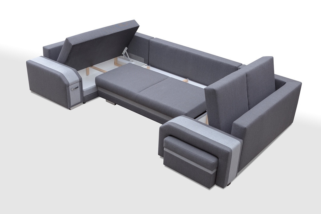 Sedací souprava Association ve tvaru U, osloví každého, kdo preferuje moderní vzhled a zároveň pohodlí a praktičnost. Sedací souprava je velmi pohodlná a dostatečně velká na posezení s přáteli, nebo rodinou. Pro případ, že se návštěva zdrží přes noc, je sedací souprava vybavena rozkladem. Pomocí automatu jednoduše sedací sopuravu přeměníte v prostorné lůžko. Sedací souprava má 3 praktické úložné prostory a další úložný prostor najdete v područi, kde je důmyslně ukrytý bar a také v taburetu. Výplň sedáků tvoří kombinace pružin faliste s kvalitní PUR pěnou. Návod na rozložení můžete shlédnout v krátkém gifu, který najdete v doplňkových fotografiích, kde také najdete fotografii s detailními rozměry. Sedací soupravu nabízíme v kvalitní potahové látce se zajímavým lemováním, a to v několika barevných provedeních. Sedací soupravu nabízíme v levém i pravém provedení, nebo také v prodedení do L. Sedací souprava bude dodána v kombinaci potahových látek, která je vyobrazena na úvodní fotografii. Vyobrazené dekorace nejsou v ceně.