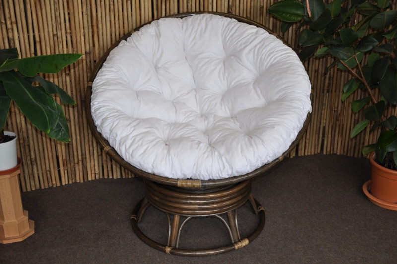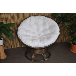 Ratanový papasan houpací pružinový v barvě ratanu hnědá, barevné provedení polstru dle obrázku. | Barva ratanové konstrukce je hnědá Pohodlné houpání zajišťuje soustava 4 pružin uchycená v kovovém pouzdře. Křeslo je zároveň otočné o 360 stupňů. Houpat a táčet se můžete tedy zároveň. Velikost ratanového křesla je 110x110x82 cm, průměr horní části 110 cm, nosnost 110 kg. Křeslo dodáváme ve smontovaném stavu. Pro zajištění maximální pevnosti jsou hlavní spoje ratanové konstrukce šroubovány. Polstr je vyrobený v České republice a je pratelný.