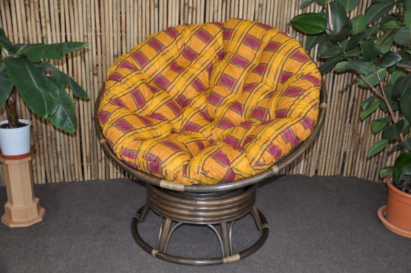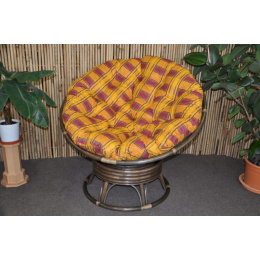 Ratanový papasan houpací pružinový v barvě ratanu hnědá, barevné provedení polstru dle obrázku. | Barva ratanové konstrukce je hnědá Pohodlné houpání zajišťuje soustava 4 pružin uchycená v kovovém pouzdře. Křeslo je zároveň otočné o 360 stupňů. Houpat a táčet se můžete tedy zároveň. Velikost ratanového křesla je 110x110x82 cm, průměr horní části 110 cm, nosnost 110 kg. Křeslo dodáváme ve smontovaném stavu. Pro zajištění maximální pevnosti jsou hlavní spoje ratanové konstrukce šroubovány. Polstr je vyrobený v České republice a je pratelný.