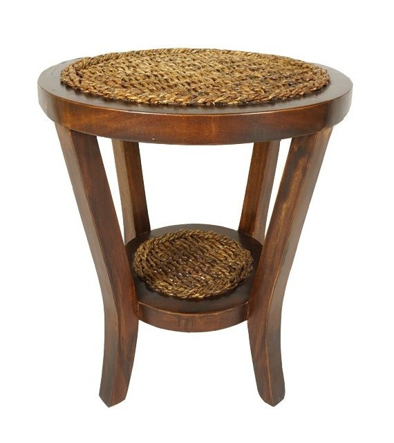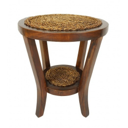 Stolek vyrobený z banánového listu v kombinaci s mahagonovým dřevem. | Průměr stolku je 50 cm. Výška stolku je 56 cm.