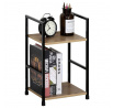 Odlehčený policový regál. Kostra vyrobena z kovových hranatých profilů černé barvy. Na police je použita MDF deska s povrchovou úpravou 3D folie v textuře dubu. Balení obsahuje sadu umožňující připevnění ke stěně.