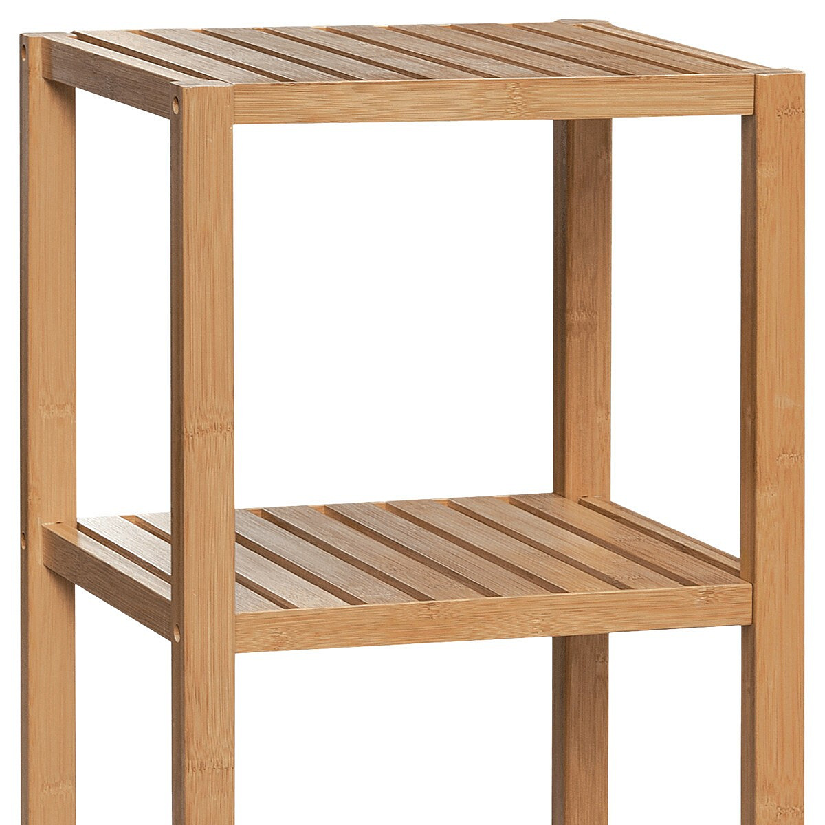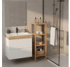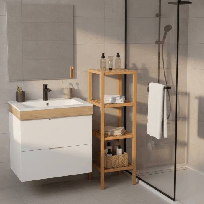 Regál z masivního bambusu nabízí čtyři prostorné police v přírodním odstínu, které jsou ideální pro organizaci a vystavení různých předmětů. Pevný rám a police z bambusového dřeva jsou navrženy pro dlouhou životnost a snadnou údržbu, přičemž přírodní textura materiálu dodává nábytku přirozený vzhled. Otevřená konstrukce umožňuje dobré větrání uložených věcí a zároveň usnadňuje přístup. Nosnost každé police je 12 kg, což zajišťuje stabilitu i při umístění těžších předmětů. Kompaktní rozměry regálu umožňují jeho využití v různých typech interiérů, od koupelen po obývací pokoje.