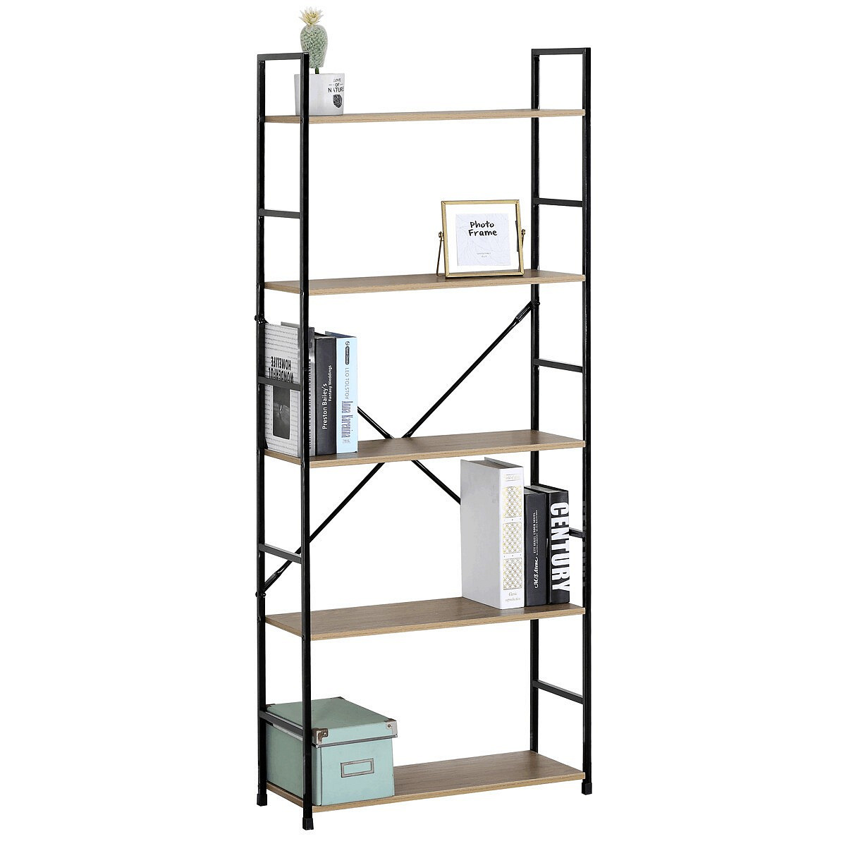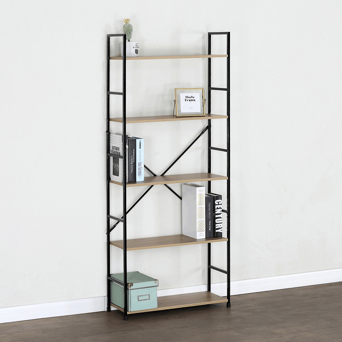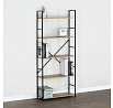 Odlehčený policový regál. Kostra vyrobena z kovových hranatých profilů černé barvy. Na police je použita MDF deska s povrchovou úpravou 3D folie v textuře dubu. Pro lepší stabilitu je na zadní straně kovová výztuha ve tvaru písmene X. Balení obsahuje sadu umožňující připevnění ke stěně.