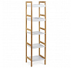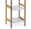 Regál s pěti policemi kombinuje pevný masiv bambus v přírodním odstínu s bílými policemi z MDF s matným lakem, což zajišťuje stabilitu a odolnost při zachování svěžího vzhledu. Bambusové bočnice jsou pevné a zároveň lehké, což usnadňuje manipulaci a přenášení. Police jsou rovné a dostatečně prostorné, každá s nosností až 15 kg, vhodné pro uložení knih, dekorací nebo drobných předmětů. Matný bílý lak na policích přispívá k snadné údržbě a odolnosti proti poškrábání. Celková konstrukce regálu je navržena tak, aby poskytovala stabilní a funkční úložný prostor s moderním přírodním designem.