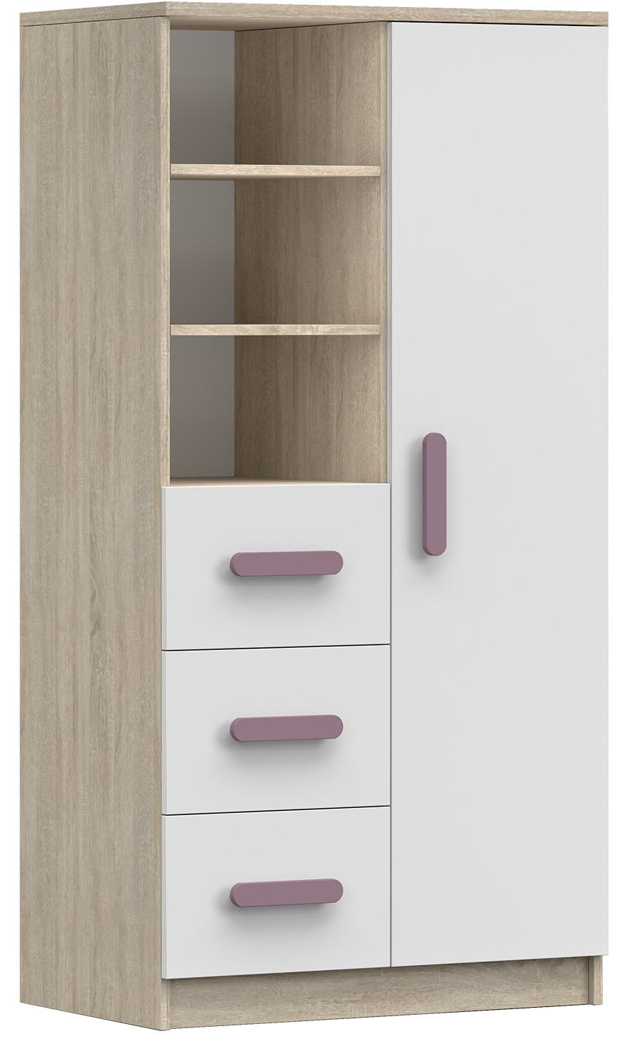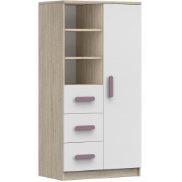 Moderní řada nábytku SMYK III potěší svou jednoduchostí a elegancí, kombinující barvu korpusu v provedení Dub Sonoma a bílou barvou čel. Dalším prvkem, který odlišuje "Smyk III", jsou ozdobné dřevěné úchytky, které jsou k dispozici v různých barvách. Právě ty dodávají nábytku charakter a vytvářejí v dětském pokoji jedinečnou a jemnou atmosféru.