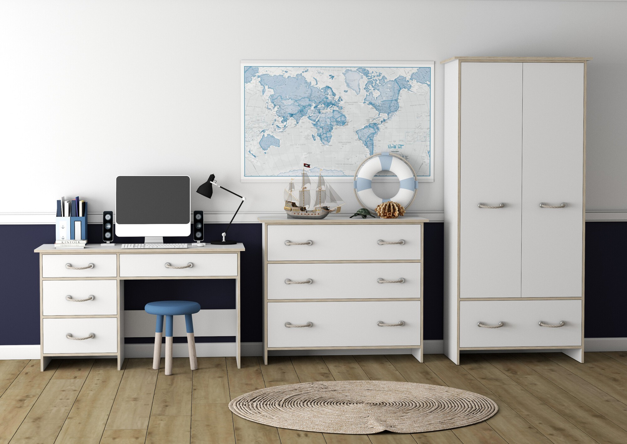 Systém COSMO je praktický nábytek do dětského pokoje, který okouzlí ozdobnými úchytkami v námořnickém stylu.