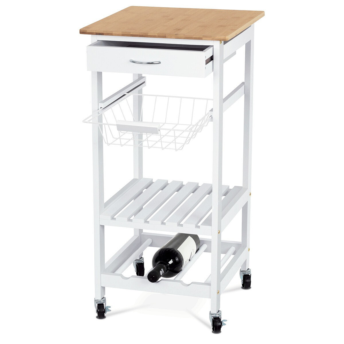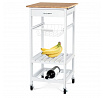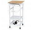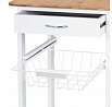 Servírovací stolek a regál DR-044 kombinuje přírodní masiv bambusové desky s bílým matným lakem na MDF nohou, což zajišťuje pevné a stabilní provedení vhodné do moderních i klasických interiérů. Vrchní deska z bambusu nabízí odolný a snadno udržovatelný povrch ideální pro přípravu a servírování jídel. Stolek je vybaven praktickou zásuvkou s kovovou úchytkou pro uložení drobných předmětů, drátěným košíkem pro snadný přístup k potravinám a dvěma policemi, které umožňují efektivní uspořádání nádobí či lahví. Pojezdová kolečka s brzdou zajišťují snadnou mobilitu a stabilitu při použití. Kompaktní rozměry a funkční design přinášejí do kuchyně nebo jídelny praktické řešení pro organizaci a servírování.