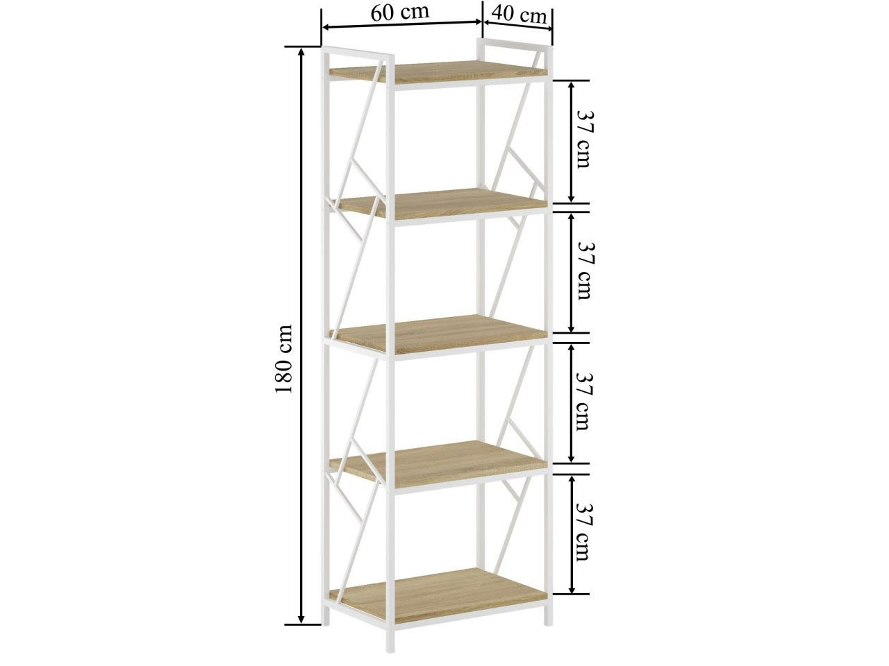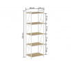 ROZMĚRY: - hloubka: 40 cm - šířka: 60 cm - výška: 180 cm MATERIÁL: - police: laminovaná dřevotříska - rám: kov lakovaný práškovou barvou BARVA: - police: přírodní dub - rám: bílý