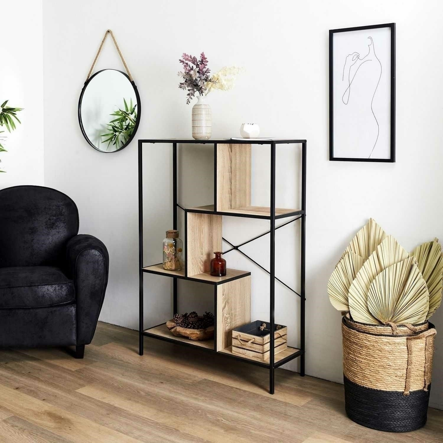 Loftový regál Rack je ideální nábytek do moderního obývacího pokoje. Nepravidelné police neobvyklého tvaru budou nejen dobrým místem pro ukládání, ale také designovou konstrukcí, která dodá loftový výraz obývacímu pokoji nebo pokoji teenagera. Police regálu jsou z MDF desky ozdobené dýhou imitující dřevo. Okraje polic a základna regálu se vzájemně doplňují díky tomu, že jsou natřeny na černo. Regál byl zpevněn kovovými příčkami, které se kříží v jeho zadní části. Zajímavým řešením jsou vertikální stěny regálu, které jsou rovněž vyrobeny z MDF desky. Výška nožek: 10 cm Hmotnost: 15 kg Rozměry balení: 36x12x122 cm