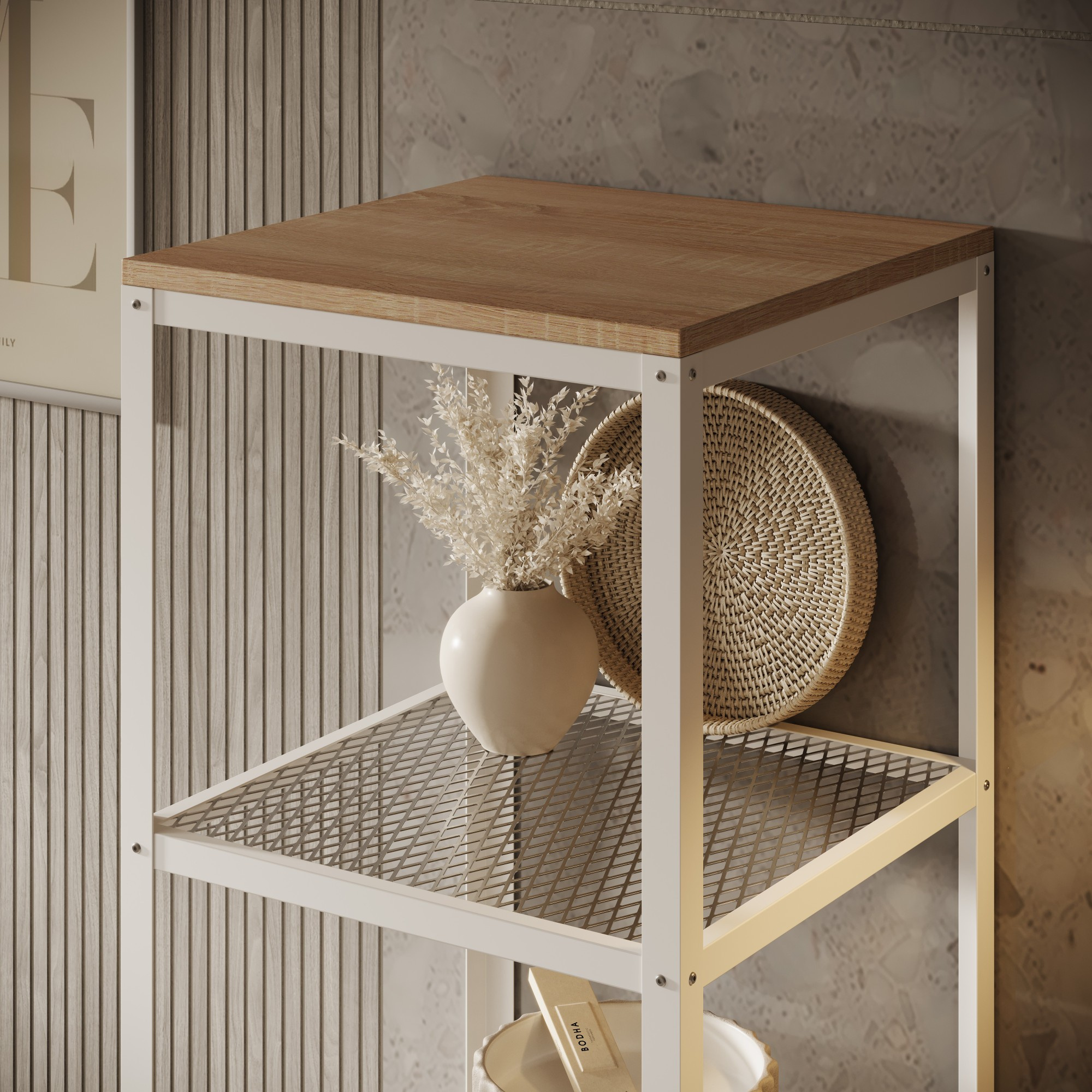 Regál Reli je ideální kombinací moderního designu a praktičnosti. Konstrukce regálu je vyrobena z pevného kovu, který zajišťuje stabilitu a trvanlivost, a zároveň dodává nábytku industriální charakter. Kovové prvky jsou lakovány práškově, což zvyšuje odolnost proti poškrábání a korozi.Další výhodou regálu jsou police vyrobené z laminované desky s přírodním povrchem, které vnášejí do interiéru teplo a útulnost. Povrchy polic jsou snadno udržovatelné v čistotě, odolné vůči vlhkosti a mechanickému poškození, což z nich činí praktickou volbu na dlouhá léta.Regál Reli se osvědčí jak v obývacím pokoji, ložnici, tak i v kanceláři nebo domácí knihovně. To univerzální nábytek, který pojme knihy, dekorace nebo rostliny, čímž vytvoří estetický a uspořádaný prostor. Jednoduchá forma a harmonické sladění materiálů způsobují, že regál Reli se dokonale hodí do moderních a loftových interiérů.