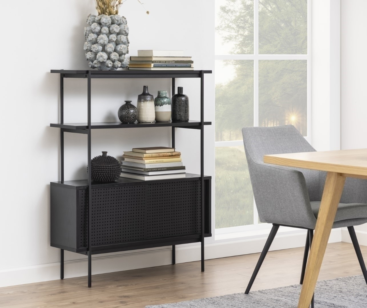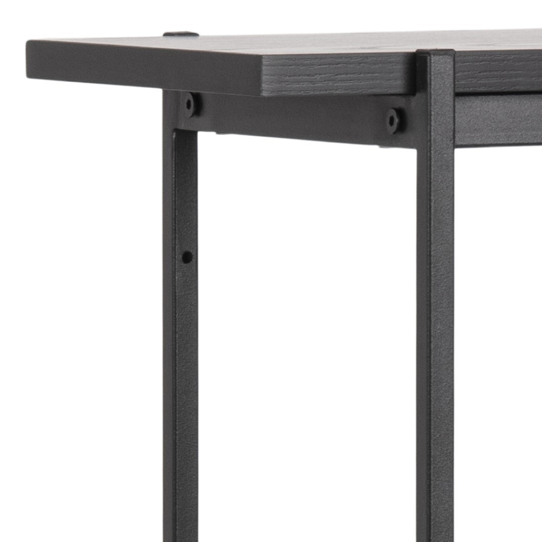 Černý regál Angus je dalším prvkem industriální kolekce se stejným názvem. Kolekce Angus dánské firmy Actona jsou industriální nábytek v elegantní černé barvě. Celý černý regál s policemi bude vhodným nábytkem jak pro elegantní kancelář, tak pro eklektický obývací pokoj. Černé police z MDF desky byly dokončeny dýhou imitující jasanové dřevo. Konstrukce regálu byla vyrobena z kovu lakovaného práškovou barvou na černo. Zajímavým doplňkem je skříňka s posuvnými čely. Ažurové čelní panely skryjí předměty, které nechceme mít na očích. Max. zatížení na polici 10 kg Rozměry balení: 119x35x14 cm Hmotnost: 20 kg