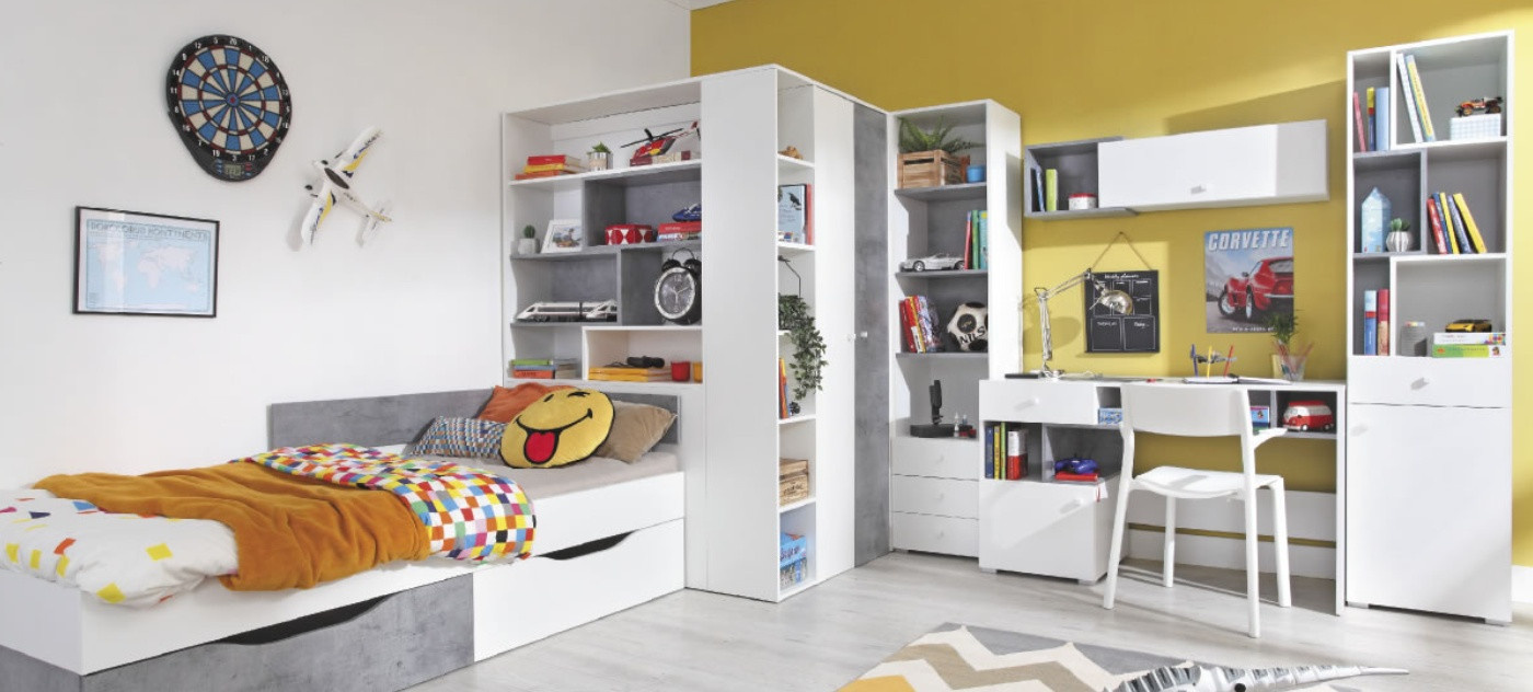 Nábytek SIGMA je určen do dětských a studentských pokojů a vyrábí se ve dvou barevných provedeních Beton+Bílý Lux+Dub a Bílý Lux+Beton.
