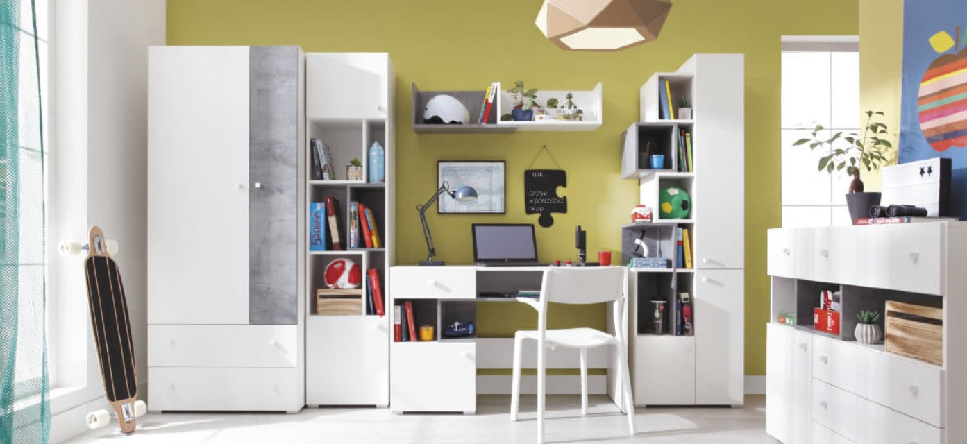 Nábytek SIGMA je určen do dětských a studentských pokojů a vyrábí se ve dvou barevných provedeních Beton+Bílý Lux+Dub a Bílý Lux+Beton.