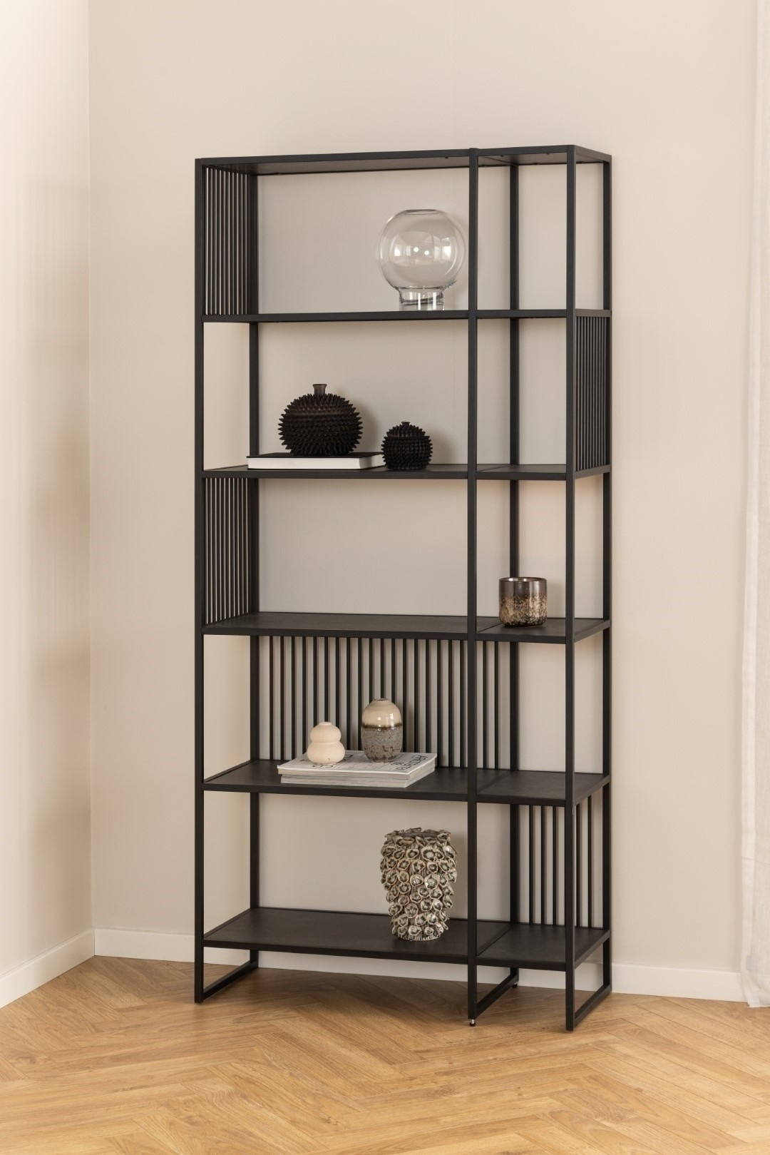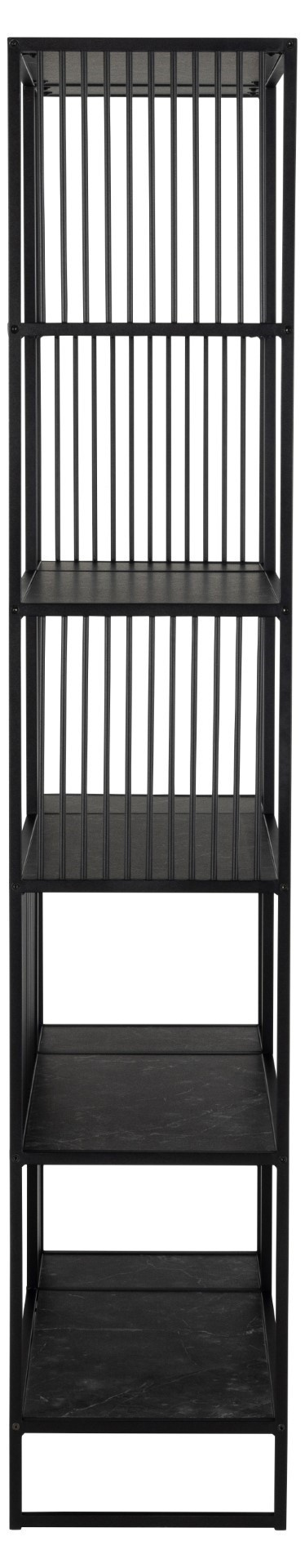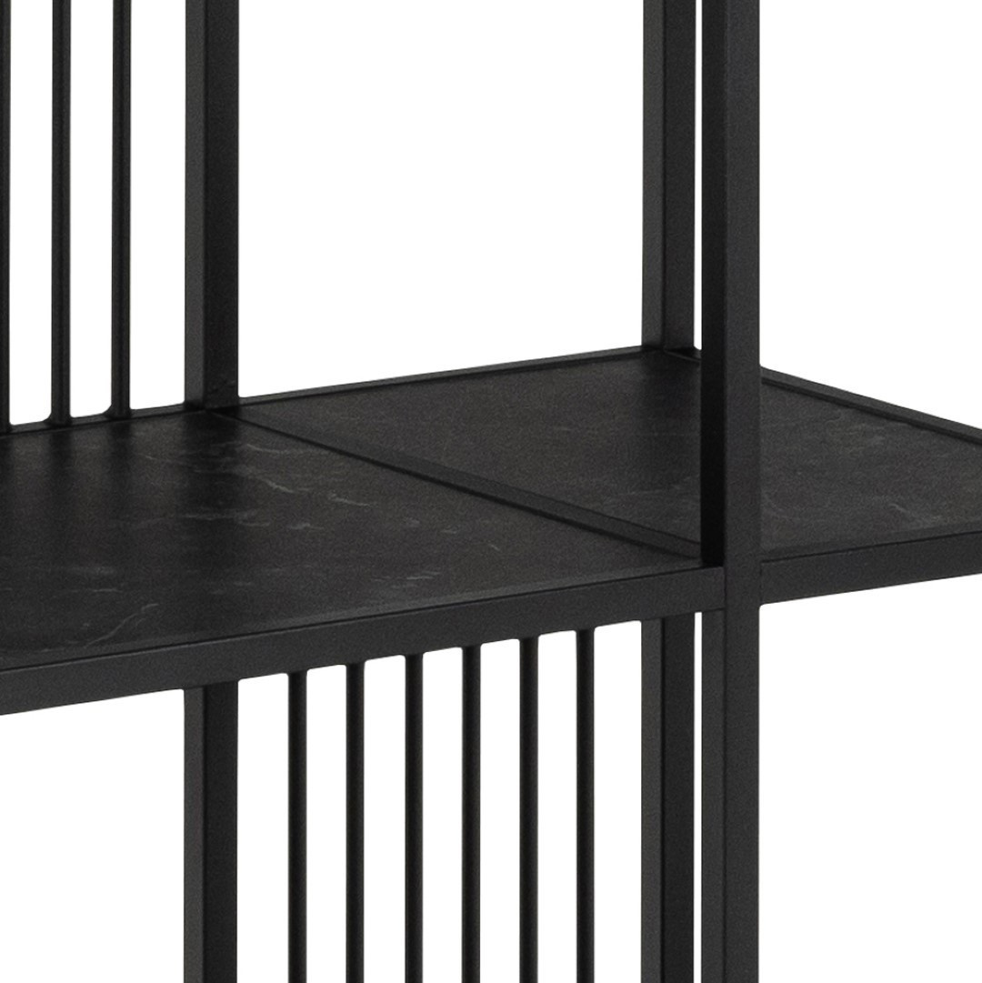 Regál Strington je kombinací rámu a základny z matné, černé oceli lakované práškovou barvou. Pět polic vyrobených z MDF bylo ozdobeno matnou, černou, melaminou. Navržen tak, aby zvýšil vizuální zájem, regál stimuluje zrak různými prvky, které mu dodávají charakteristický vzhled. Zabudované v černém ocelovém rámu s vertikálními dráty, police jsou ozdobeny efektem černého mramoru a nabízejí dostatek místa pro uložení drobných dekorací a sentimentálních předmětů. Regál udělá dobrý dojem v každém prostoru obývacího pokoje, jídelny nebo kuchyně. Moderní regál nabízející spoustu úložného prostoru. Vybaven 5 policemi zdobenými černým mramorem. Odolný ocelový rám s práškovým nástřikem v černé barvě zajišťuje stabilitu. Svislé kulaté dráty dodávají třídu a eleganci. Max. zatížení na polici 19 kg Hmotnost regálu 23 kg Vyžaduje montáž Rozměry kartonu: 193x39x14 cm