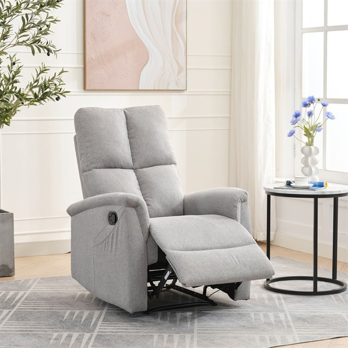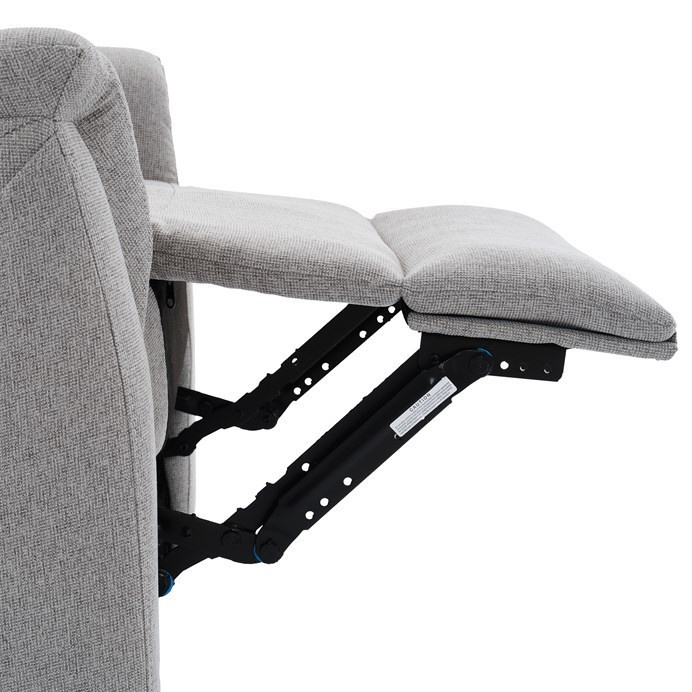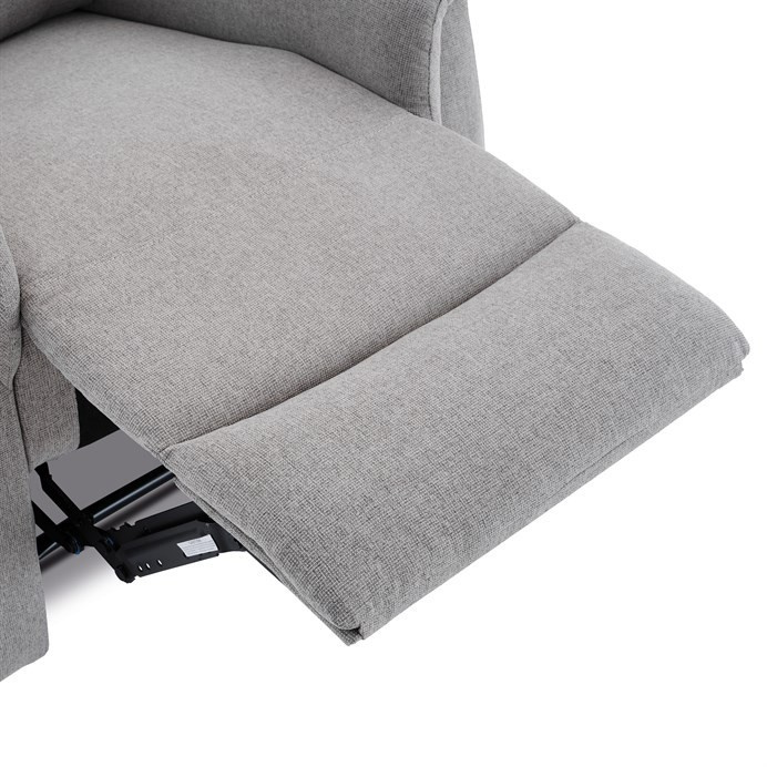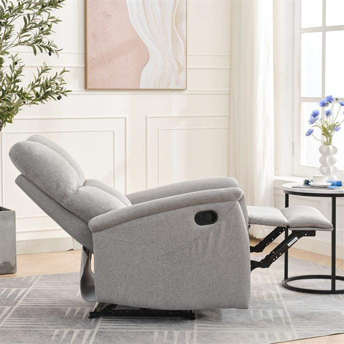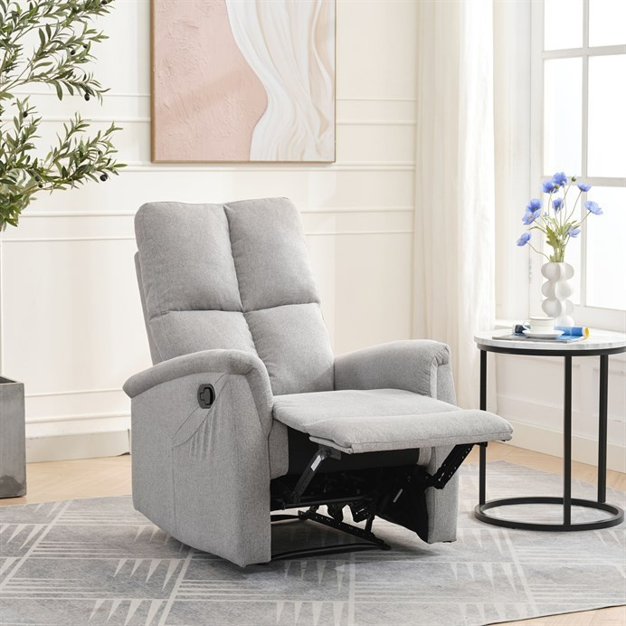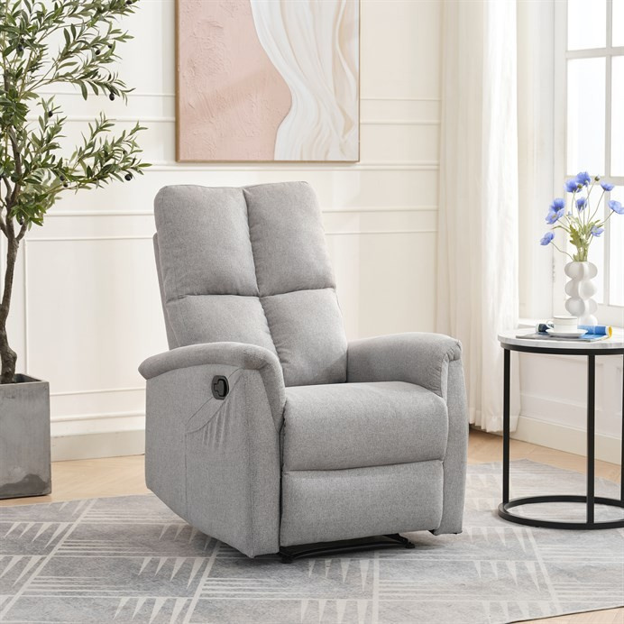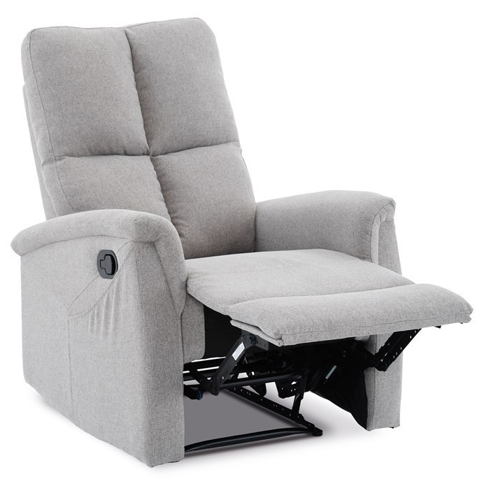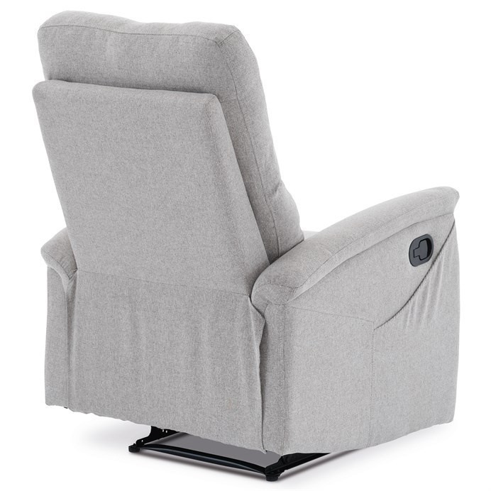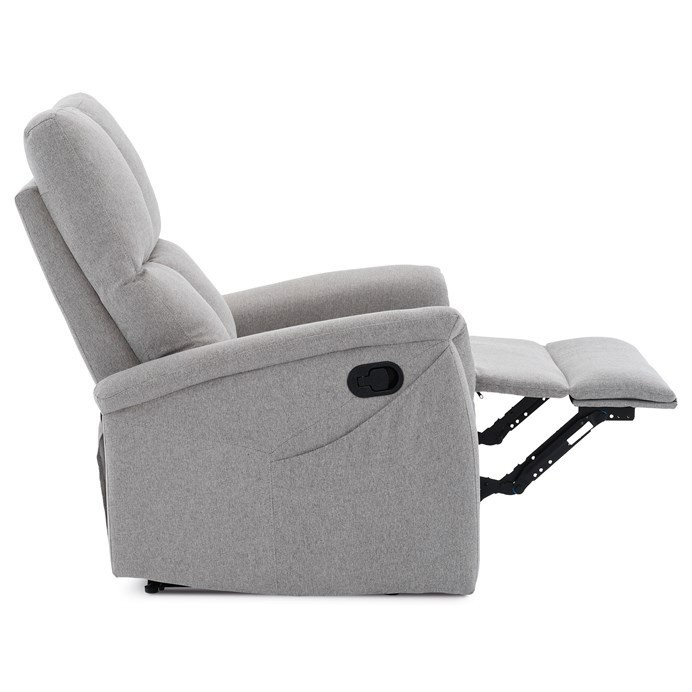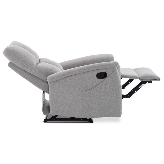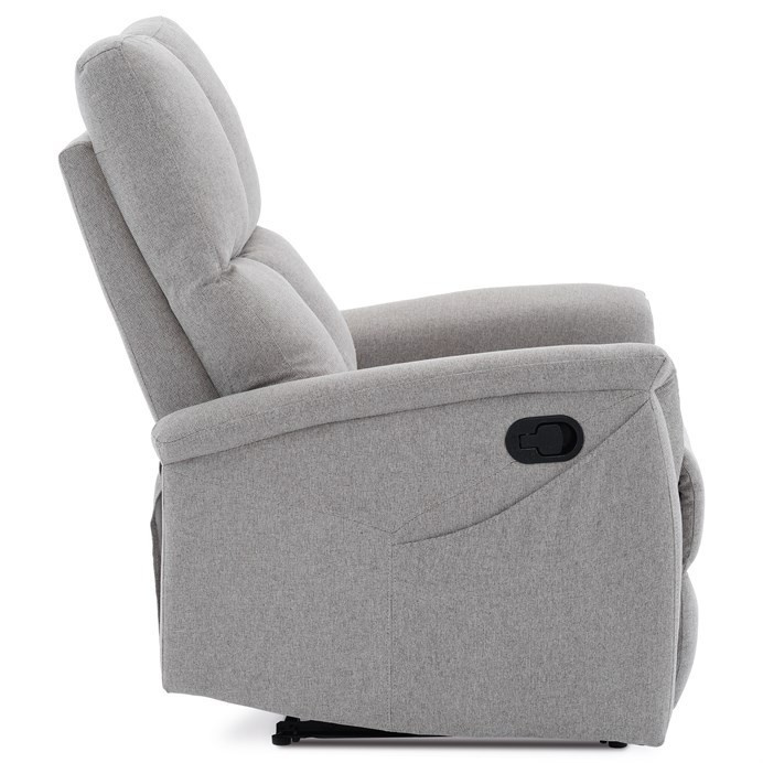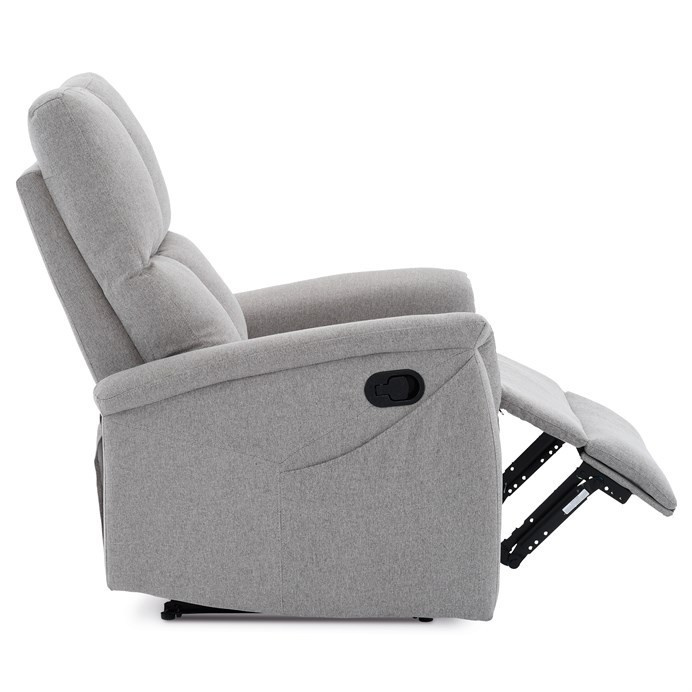 Polohovací křeslo, světle šedé barvy, s manuálním ovládáním. Toto komfortní křeslo je vybaveno postranní pákou, která umožňuje snadné zvednutí podnožky. Na boku křesla je praktická kapsa pro uložení drobností, jako jsou časopisy, dálkový ovladač nebo mobilní telefon. Křeslo je navrženo pro maximální pohodlí a ergonomii, poskytuje vynikající podporu zad a relaxaci. Ideální pro každodenní odpočinek doma.