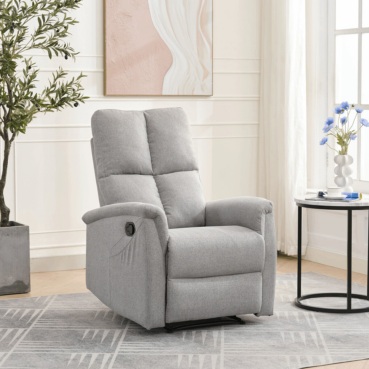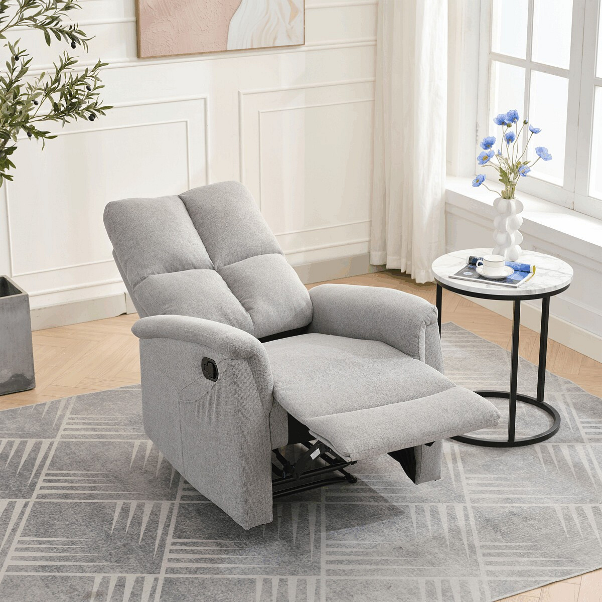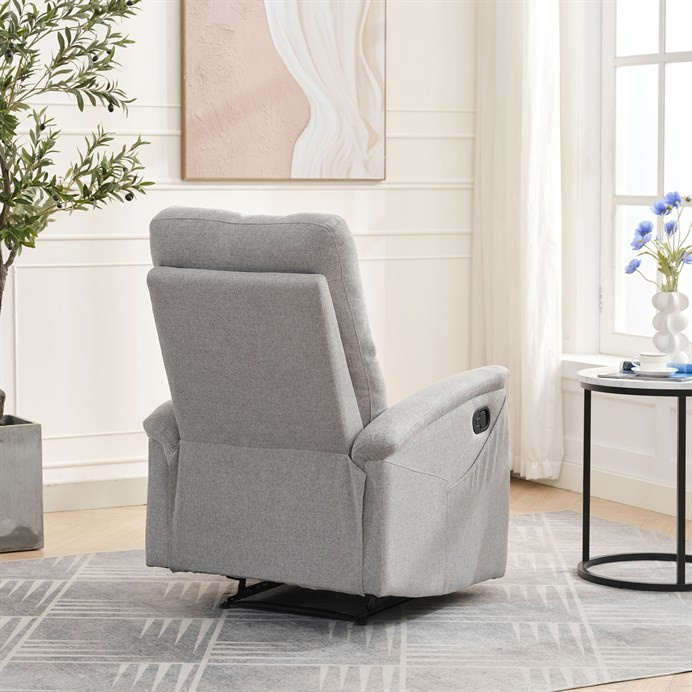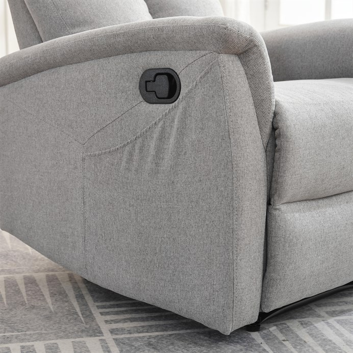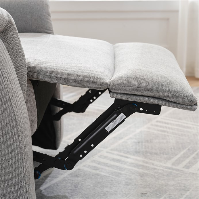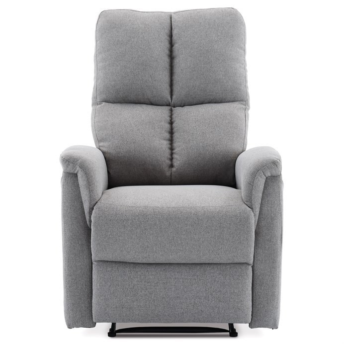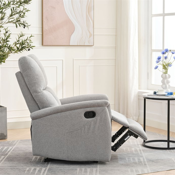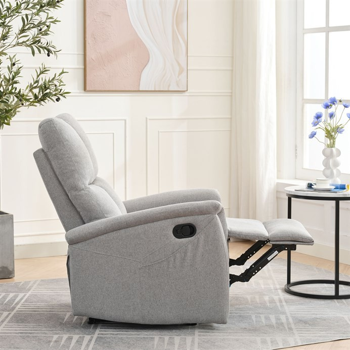 Polohovací křeslo, světle šedé barvy, s manuálním ovládáním. Toto komfortní křeslo je vybaveno postranní pákou, která umožňuje snadné zvednutí podnožky. Na boku křesla je praktická kapsa pro uložení drobností, jako jsou časopisy, dálkový ovladač nebo mobilní telefon. Křeslo je navrženo pro maximální pohodlí a ergonomii, poskytuje vynikající podporu zad a relaxaci. Ideální pro každodenní odpočinek doma.