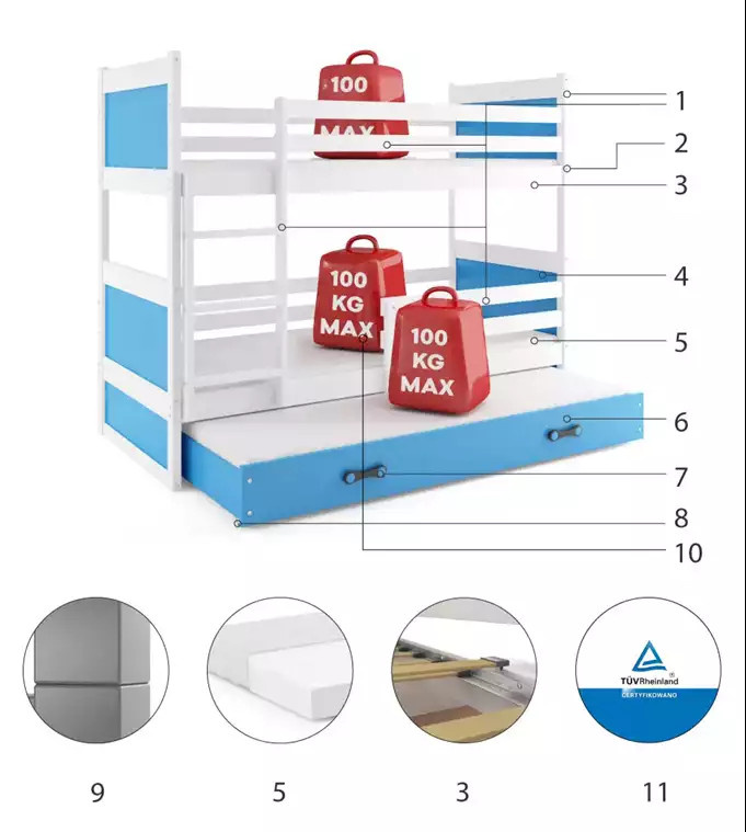 Dětská patrová postel RICO 3 s přistýlkou 90x200 cm, včetně matrací, Bílá/Modrá