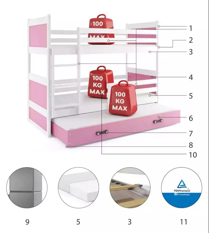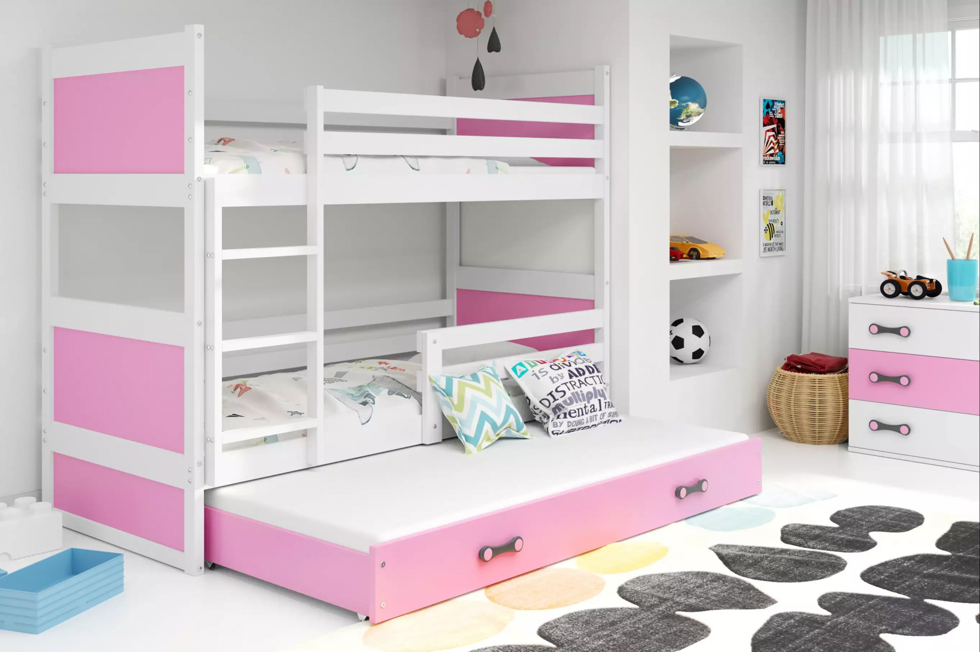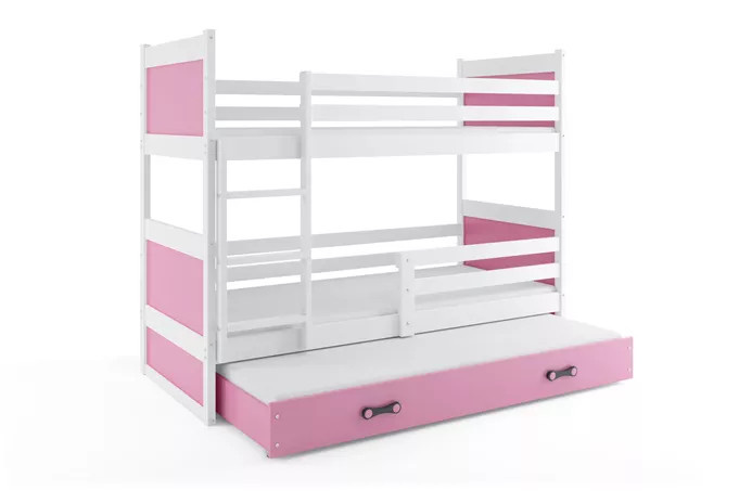 Dětská patrová postel RICO 3 s přistýlkou 90x200 cm, bez matrace, Bílá/Růžová