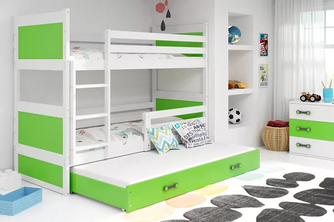 Dětská patrová postel RICO 3 s přistýlkou 90x200 cm, včetně matrací, Bílá/Zelená