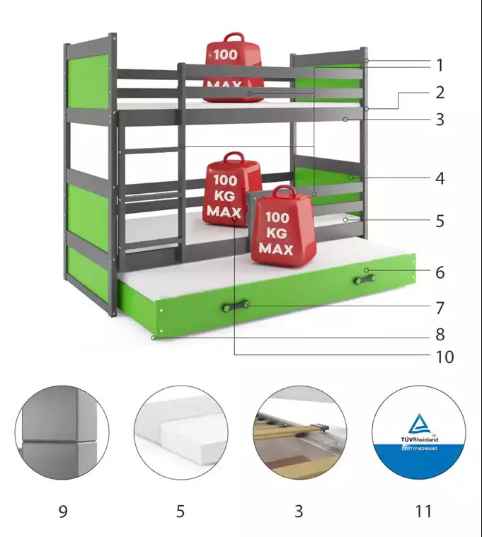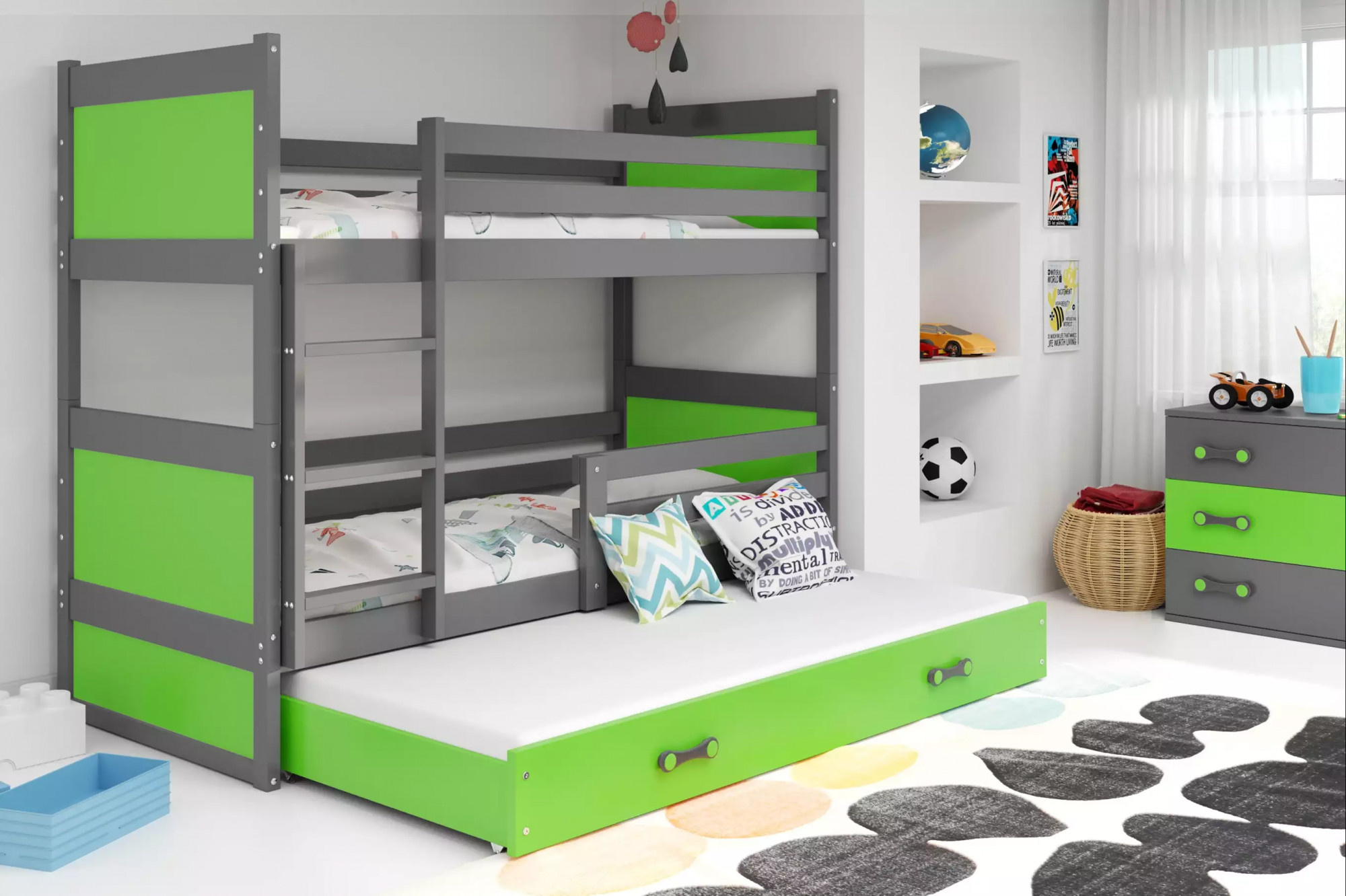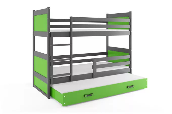 Dětská patrová postel RICO 3 s přistýlkou 90x200 cm, bez matrace, Grafit/Zelená