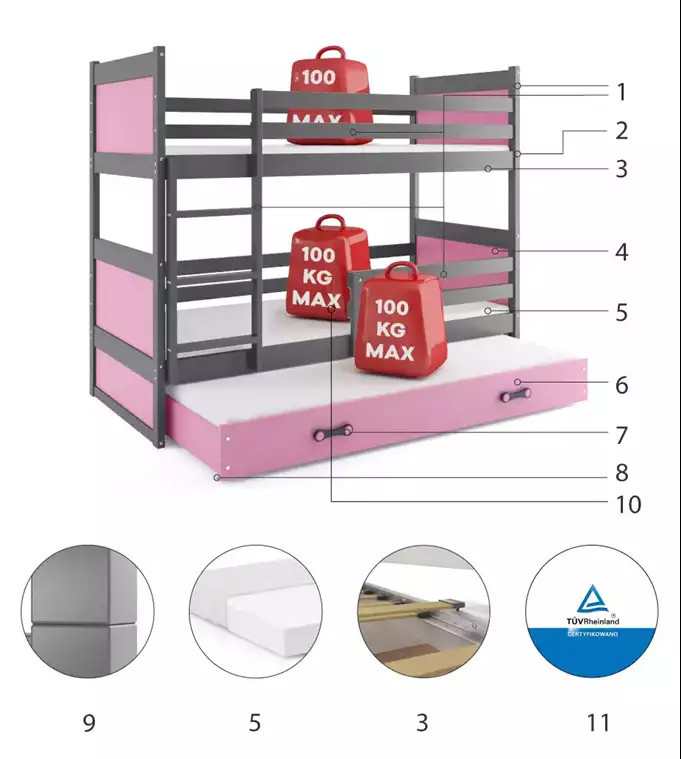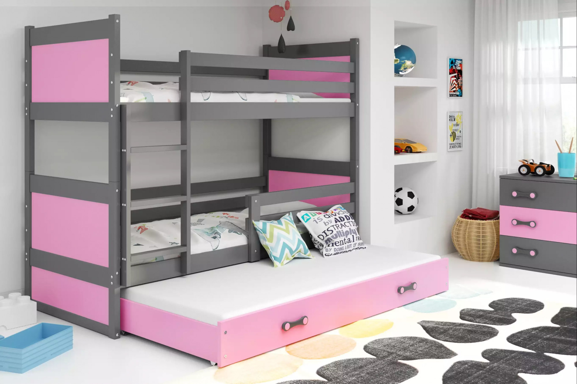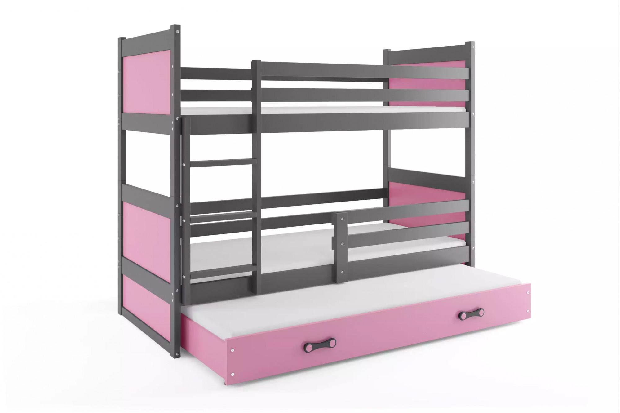 Dětská patrová postel RICO 3 s přistýlkou 90x200 cm, bez matrace, Grafit/Růžová