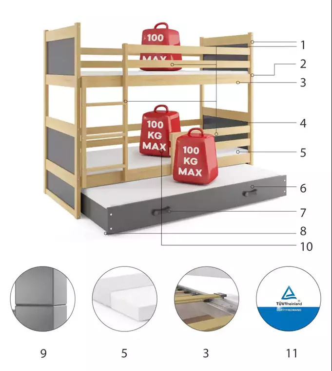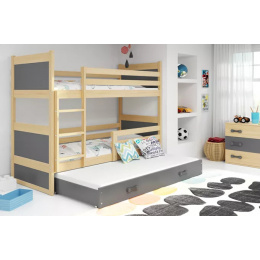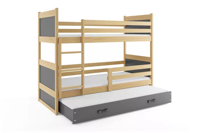 Dětská patrová postel RICO 3 s přistýlkou 90x200 cm, včetně matrací, Přírodní/Grafit