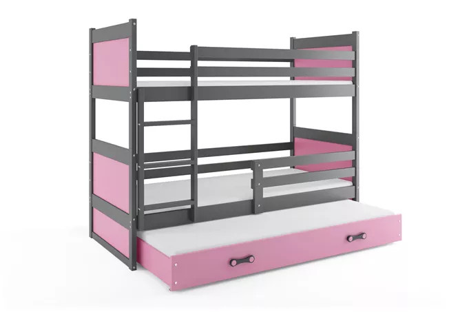 Dětská patrová postel RICO 3 s přistýlkou 90x200 cm, včetně matrací, Grafit/Růžová