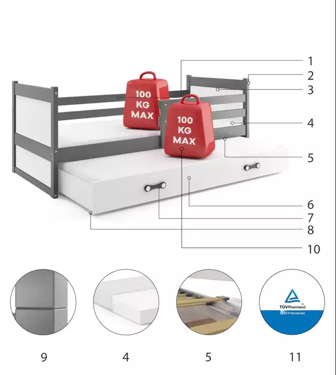 Dětská postel RICO s přistýlkou 90x190 cm, s matracemi, Grafit/Bílá