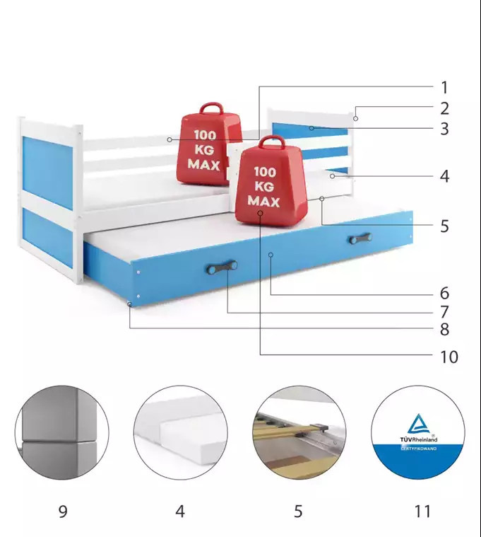 Dětská postel RICO Bílá/Modrá, s přistýlkou 90x200 cm, bez matrace