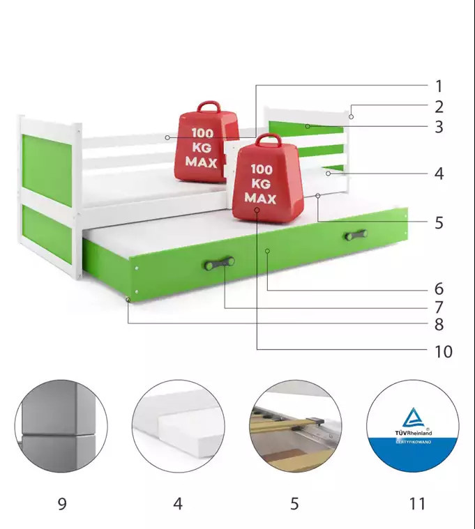 Dětská postel RICO Bílá/Zelená, s přistýlkou 90x200 cm, bez matrace