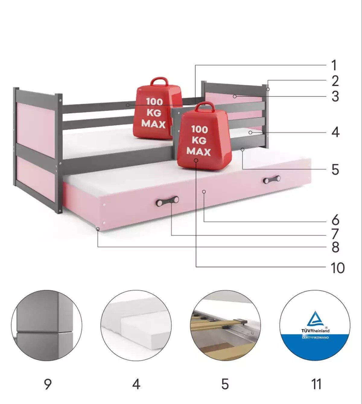 Dětská postel RICO Grafit/Růžová, s přistýlkou 90x200 cm, bez matrace