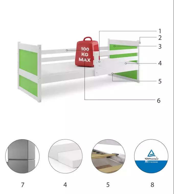 Dětská postel RICO 90x190 cm, bez matrace, Bílá/Zelená