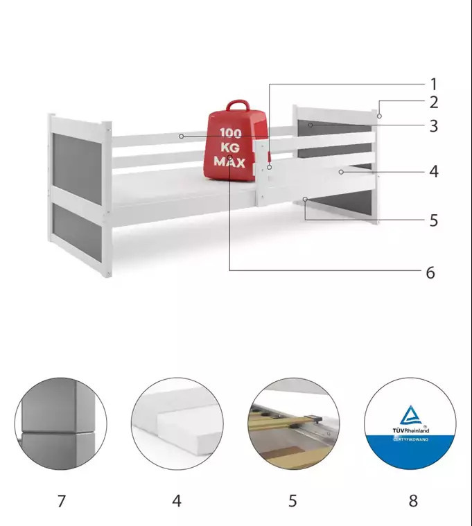 Dětská postel RICO 90x200 cm, s matrací, Bílá/Grafit
