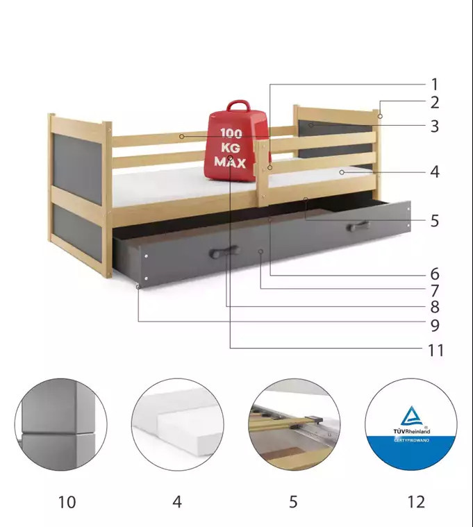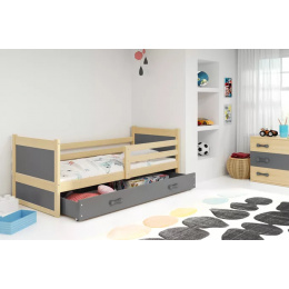 Dětská postel RICO 90x190 cm se šuplíkem, s matrací, Přírodní/Grafit