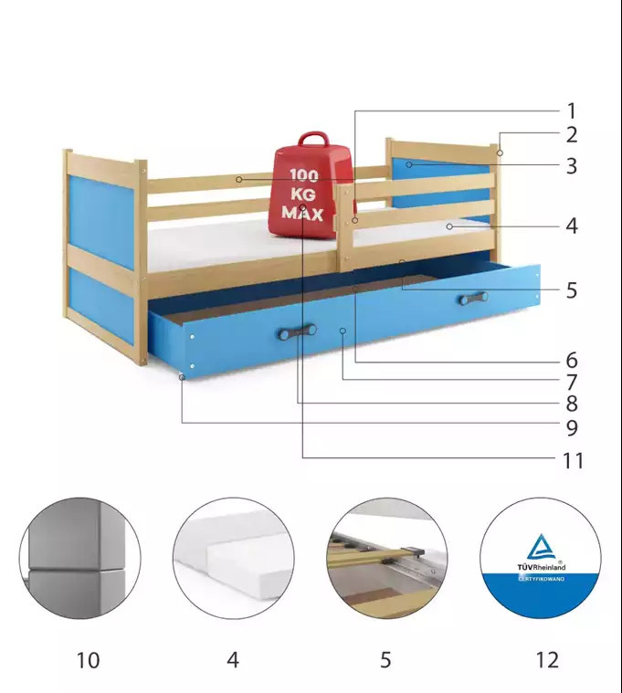 Dětská postel RICO 90x190 cm se šuplíkem, bez matrace, Přírodní/Modrá