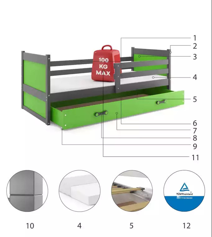 Dětská postel RICO 90x200 cm se šuplíkem, s matrací, Grafit/Zelená